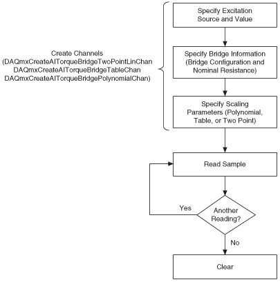 The following flowchart depicts the main steps required in an NI-DAQmx application to measure torque. Alternatively, you can configure a task for measuring torque using the DAQ Assistant.
