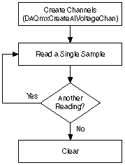 The following flowchart depicts the main steps required in an NI-DAQmx application to measure voltage. Alternatively, you can configure a task for measuring voltage using the DAQ Assistant.
