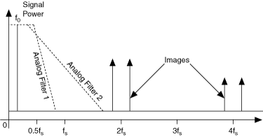 A digital waveform must be updated at least twice as fast as the bandwidth of the desired analog signal to be accurately generated (Shannon's Sampling Theorem). Even though the theoretical requirement for sample clock, fs, is twice that of the signal bandwidth, fo, images are introduced in the output signal at |f o ± nfs|, as shown in the following figure.
