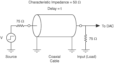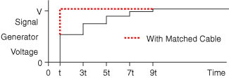 In this example, selectable source impedances are provided at the signal generator outputs to accommodate the most popular coaxial cable characteristic impedances: 50 Ω and 75 Ω. The following figure shows what happens when, as in this example, a coaxial cable of the wrong characteristic impedance (50 Ω) is used with 75 Ω source and load impedances.