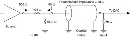 Signal generators with low/high-source impedance can be matched with a resistor placed in series (shunt) such that the total source impedance (admittance) is matched to the cable characteristic impedance (admittance). Signal generators that are not capable of driving the cable impedance directly can be coupled through a matching L-pad. In this case, the signal generator sees an approximately 500 Ω load, while the source impedance presented to the cable is 50 Ω, as the following figure shows.
