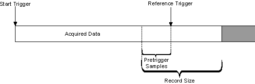 After the device recognizes the start trigger and acquires the configured number of pretrigger samples, the device can now recognize a reference trigger. While waiting for the reference trigger, the device is still sampling data into the device memory. If the record overflows, the newest samples overwrite the oldest samples in the record. After the reference trigger is received, the device acquires enough posttrigger samples and finishes the acquisition, as shown in the following figure: