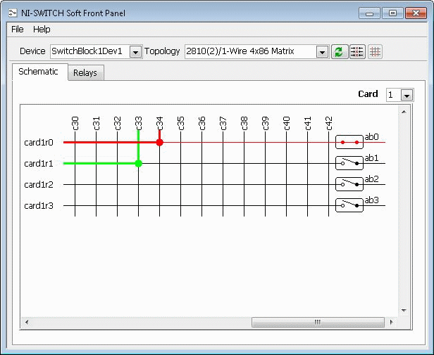 The following schematic shows a connection between a row and column on the same card (card1r1 to c33 on card 1), and connections between channels on multiple cards in the same device through an analog bus line (row 0 connected to ab0 on both cards).