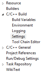 Selecting the internal builder uses C/C++ Development Tools for NI Linux Real-Time, Eclipse Edition, instead of an external build file, to build the executable. - Expand C/C++ Build in the Properties tree and select Settings.