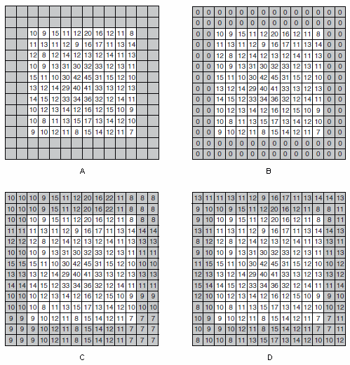 Vision provides three ways to specify the pixel values of the image border. The following figure illustrates these options. Figure A shows the pixel values of an image. By default, all image border pixels are uninitialized. You can set all of the border pixels to have a value of 0, as shown in figure B. You can copy the values of the pixels along the edge of the image into the border pixels, as shown in figure C, or you can mirror the pixel values along the edge of the image into the border pixels, as shown in figure D.