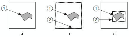 The following figure illustrates the different methods of applying image masks. Figure A shows the ROI in which you want to apply an image mask. Figure B shows an image mask with the same size as the inspection image. In this case, the offset is set to [0, 0]. A mask image also can be the size of the bounding rectangle of the ROI, as shown in figure C, where the offset specifies the location of the mask image in the reference image. You can define this offset to apply the mask image to different regions in the inspection image.
