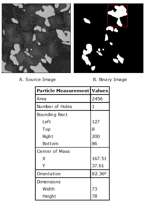 The following figure shows a sample list of parameters that you can obtain in a particle analysis application. The binary image in this example was obtained by thresholding the source image and removing particles that touch the border of the image. You can use these parameters to identify and classify particles. The following figure shows the values obtained for the particle enclosed in a rectangle.