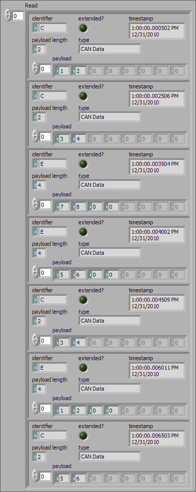 Frame C and frame E are returned in a single array of frames. Each frame is displayed with CAN-specific elements. To understand the data returned from Read, refer to information on the format of raw frame data. This example uses hexadecimal C and E as the identifier of each frame. The signal data is contained in the first two payload bytes. The timestamp represents the absolute time when the interface received the frame (end of frame), accurate to microseconds.