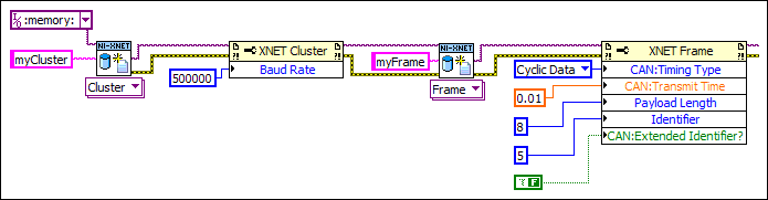 The figure above shows a sample diagram that creates a cluster and frame in memory. The database name is :memory:. This special database name specifies a database that does not originate from a file. The cluster name is myCluster. For CAN, the only property required for the cluster is Baud Rate. The cluster is wired to create a frame object named myFrame. The frame has several required properties. The XNET Frame CAN:Timing Type property specifies how to transmit the frame, with Cyclic Data meaning to transmit every CAN:Transmit Time seconds (0.01, or 10 ms). The remaining properties configure the frame to use 8 bytes of payload data and CAN standard ID 5. If the subsequent diagram passed the frame to the XNET Create Session (Frame Output Queued) VI, this would create a session you can use to write data for transmit.