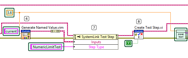 6 Generate Named Value converts the data you want to add to the test step as a named value object. Wire Build Array to the named value this VI generates to format the test data. 7 The Property Node sets the inputs for the test step using the named values the Build Array returns. 8 Create Test Step adds the local test step reference to the server with the properties you set. You can run a test VI after Create Test Step. Note In a more advanced test sequence, you may determine a standard VI prototype and load test VIs from a directory on disk. - Add the following code to collect data, update the test step data, and update