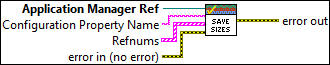 Refnums specifies an array of clusters with an ActiveX container reference or a LabVIEW tab control reference. The VI saves the sizes of these controls. |