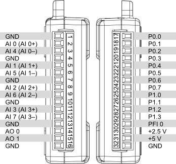 1 ±20 V means that |AI+ – (AI–)| ≤ 20 V. However, AI+ and AI– must both be within ±10 V of GND. Refer to the Taking Differential Measurements section of the NI USB-6008/6009 User Guide for more information.