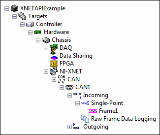 Traverse the hierarchy of sections that will appear under the new CAN port to get the Single-Point section. Add a new signal-based frame associated with the XNET database from step 5, to the Single-Point section. |