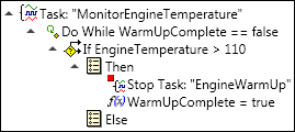 Note In the Primitives palette, expand to find the DoWhile Loop and to find If Else.As long as the WarmUpComplete variable is false, the MonitorEngineTemperature task monitors the engine temperature (EngineTemperature) to ensure it does not exceed 110 degrees. If the engine temperature exceeds 110 degrees, the engine shuts down and the sequence aborts. If the engine temperature remains below 110 degrees, the sequence completes its execution and turns off the engine. - Save the real-time sequence.