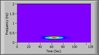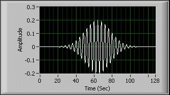 Use the TFA Adaptive Transform VI to select either Gaussian chirplet or Gaussian pulse as the elementary function to represent a signal. When you choose the Gaussian pulse in the elementary functions, this VI forces the chirp rate βk to 0. The following illustrations show the waveform and the time-frequency spectrogram of the linear Gaussian pulse in this situation: