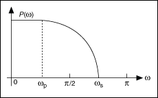 In a general equiripple halfband filter, halfband refers to a filter in which ωs + ωp = π, where ωs denotes the stopband frequency and ωp denotes the passband frequency, as shown in the following figure.