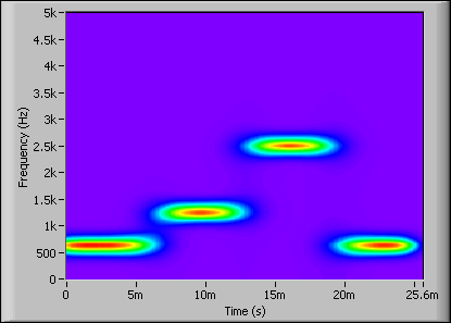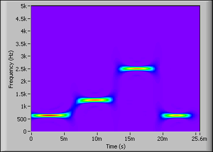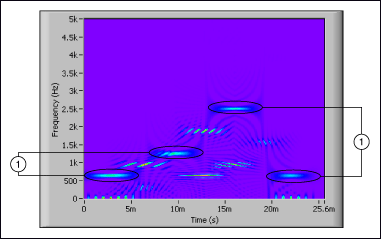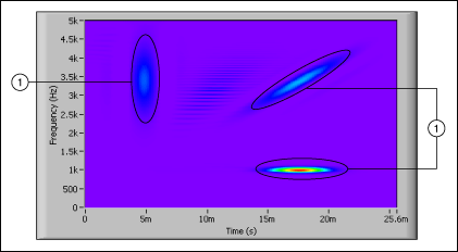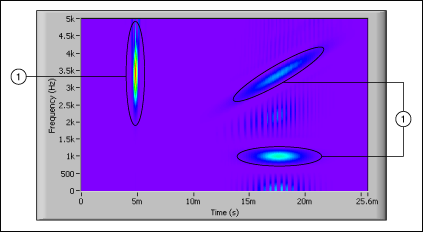 You can use the Gabor spectrogram method to reduce the cross-term interference of the WVD. This method decomposes a signal with the Gabor expansion and then sums the WVD of each auto-term with some cross-terms. Because the Gabor spectrogram method uses the Gabor expansion first and then the WVD, the Gabor spectrogram also is called the Gabor expansion-based spectrogram. The Gabor spectrogram also is called the time-frequency distribution series. The Gabor spectrogram is a method unique to the LabVIEW Time Frequency Analysis Tools.