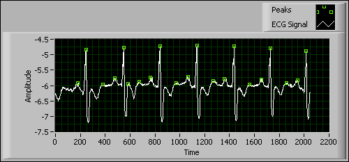 The following figure shows an example that uses the WA Online Multiscale Peak Detection VI to detect peaks in an electrocardiogram (ECG) signal. The UWT-based method locates the peaks of the ECG signal accurately, regardless of whether the peaks are sharp or rounded.