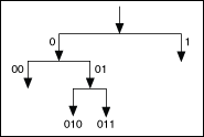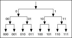 The numbers indicate the path of each node. The path is a combination of the characters 0 and 1, where 0 represents lowpass filtering followed by a decimation with a factor of two, and 1 represents highpass filtering followed by a decimation with a factor of two.