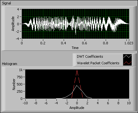 The following figure shows the decomposition of the Chirps signal. The resulting histogram of the wavelet packet coefficients is more compact than the histogram of the DWT coefficients. Therefore, the wavelet packet decomposition can achieve a higher ratio for signals like the Chirps signal.