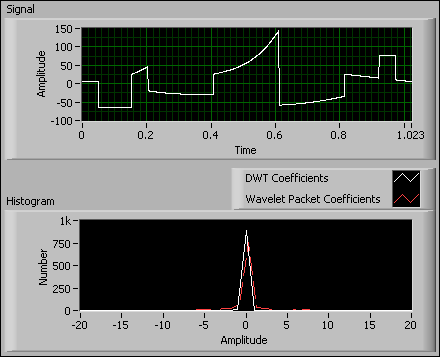 For example, the wavelet packet decomposition and the DWT with the sym8 wavelet, decomposition level 4, and periodic extension are applied to the Piece Polynomial signal and the Chirps signal. The following figure shows the decomposition of the Piece Polynomial signal. The resulting histogram of the wavelet packet coefficients is similar to the histogram of the discrete wavelet coefficients, meaning that the DWT and the wavelet packet decomposition have similar compression performance for the Piece Polynomial signal.