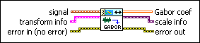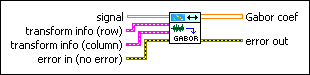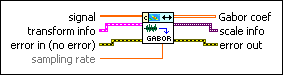 Decomposes signal as a linear combination of Gabor elementary functions, which are complex sinusoids with a window envelope. You can use the TFA Discrete Gabor Expansion VI to reconstruct the time-domain signal. Wire data to the signal input to determine the polymorphic instance to use or manually select the instance.