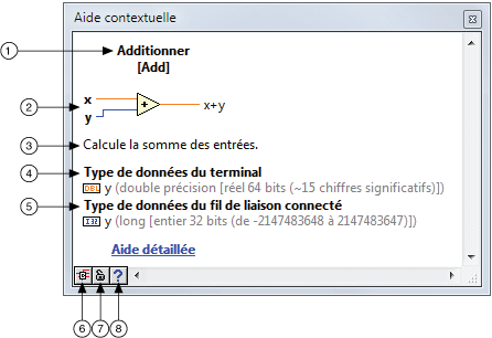 | 8 | Aide détaillée | S'il existe une rubrique de l'Aide LabVIEW pour cet objet, ouvre la rubrique pour afficher de plus amples informations sur l'objet. |