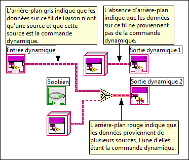 Les fils de liaison de classe LabVIEW qui ne proviennent pas d'une entrée dynamique n'ont pas de couleur d'arrière-plan. L'arrière-plan du fil de liaison est gris si le fil provient d'une entrée dynamique et qu'il ne passe par aucune fonction susceptible de changer le type de données à l'exécution. Un arrière-plan rouge indique que les données du fil de liaison proviennent de plusieurs sources, dont une est le terminal d'entrée dynamique.