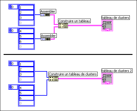 L'exemple suivant illustre deux façons de construire un tableau de clusters. Vous pouvez utiliser la fonction Construire un tableau de clusters pour augmenter l'efficacité de l'implémentation, comme le montre la section du bas dans l'exemple suivant.