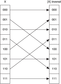 L'illustration suivante montre l'ordre inversé (ordre des bits inversé) en base 2 de 8 éléments.