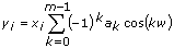Si a représente la séquence en entrée Coefficients cosinus et si Y représente la séquence en sortie X fenêtré, le VI Fenêtre cosinus générale obtient les éléments de Y à partir de la formule
