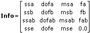 Info correspond à une matrice (4, 4) organisée, où la première colonne correspond à la somme des carrés associée avec le facteur A, le facteur B, l'interaction AB et l'erreur résiduelle. La deuxième colonne correspond aux degrés de liberté (dof) respectifs. La troisième colonne correspond aux moyennes quadratiques (ms) respectives. La quatrième colonne correspond aux valeurs de F respectives. ![]()