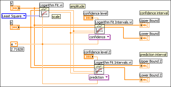 Si le bruit de Y est à distribution gaussienne, utilisez les deux instances du VI polymorphe pour calculer l'intervalle de confiance et l'intervalle de prédiction. Le diagramme suivant montre comment calculer l'intervalle de confiance et l'intervalle de prédiction en utilisant le VI Intervalles d'ajustement logarithmique. Vous devez ajuster les observations avec le VI Ajustement logarithmique en utilisant la méthode des moindres carrés pour obtenir l'amplitude et l'échelle.