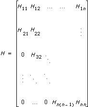 Par définition, une matrice de Hessenberg est une matrice qui comporte des zéros sous la sous-diagonale principale, comme le représente la matrice suivante.