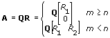 où m est le nombre de lignes n est le nombre de colonnes dans A, Q est une matrice unitaire (m, m), R est une matrice trapézoïdale supérieure (m, n), R1 est une matrice triangulaire (k, k) où k est le minimum de m et n, R2 est une sous-matrice (m, n-m) de R et 0 est une matrice nulle (m-n, n).