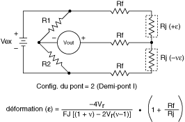 Dans les diagrammes de circuit, VOUT représente la tension que vous mesurez pour passer au VI de conversion en tant que Vjc. Dans les configurations en quart de pont et en demi pont, R1 et R2 sont des résistances factices qui ne sont pas incorporées directement dans la formule de conversion.