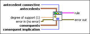 antécédents spécifie les antécédents, ou parties SI, de la règle. Chaque antécédent consiste en trois parties : l'indice d'une variable linguistique d'entrée, un opérateur qui spécifie s'il faut calculer le degré d'appartenance ou le degré de non-appartenance de la variable linguistique d'entrée à un terme linguistique, et l'indice du terme linguistique. Les indices correspondent à l'ordre dans lequel les variables ou termes linguistiques ont été créés. Vous pouvez utiliser la fonction Construire un tableau ou une boucle pour construire un tableau d'antécédents de règles que vous créez avec le VI LF - Créer un antécédent. Vous pouvez ensuite câbler le tableau à cette entrée. |