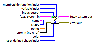 Modifie la forme, la couleur ou les points d'une fonction d'appartenance pour une variable linguistique. Vous pouvez modifier une fonction d'appartenance à partir d'un système flou ou d'un tableau de fonctions d'appartenance. Le type de données que vous câblez à l'entrée système flou en entrée détermine l'instance polymorphe à utiliser.