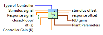 Implémente le réglage automatique en utilisant la méthode de réglage associée à l'instance polymorphe que vous sélectionnez. Ce VI génère les paramètres PID en fonction du Signal de stimulus et du Signal de réponse que vous spécifiez. Vous pouvez utiliser ce VI pour générer les paramètres initiaux quand vous n'avez pas suffisamment d'informations sur le système que vous voulez régler. Vous devez sélectionner manuellement l'instance polymorphe à utiliser.PID - Conception de réglage automatique (auto)