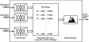 Après avoir fuzzifié les valeurs d'entrée d'un système flou, le régulateur flou utilise les termes linguistiques d'entrée correspondants ainsi que la base de règles pour déterminer les termes linguistiques résultant des variables linguistiques de sortie.