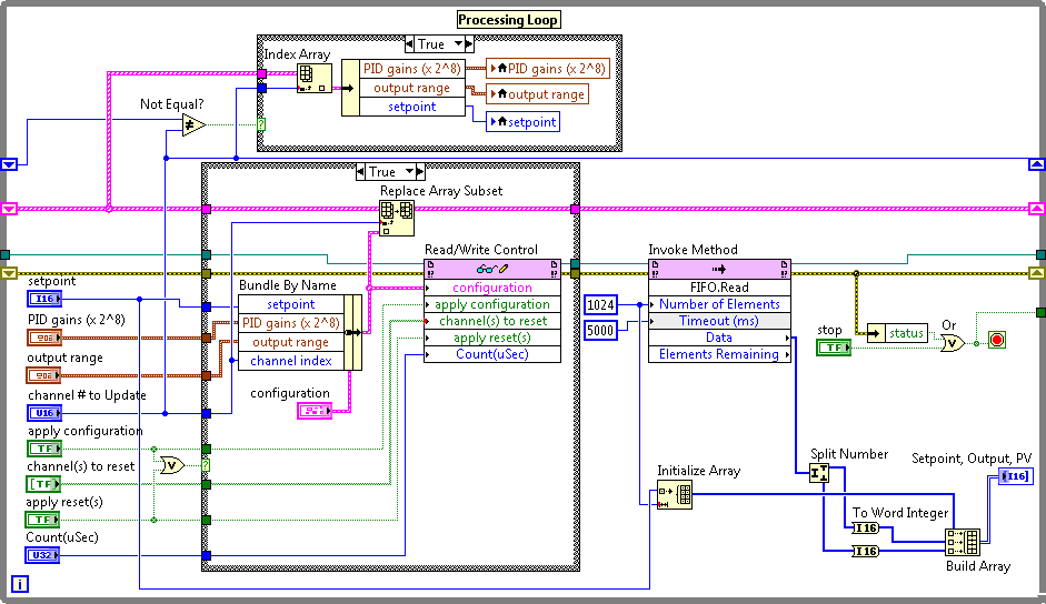 La réinitialisation d'une voie du PID entraîne la réinitialisation des états internes de la voie à 0 et relance l'algorithme de PID en utilisant soit les valeurs des paramètres en mémoire, soit les valeurs des paramètres du VI hôte. Pour modifier différents paramètres, vous devez spécifier l'indice de la voie afin d'indiquer à l'algorithme de PID le numéro de la voie à laquelle les nouvelles valeurs de paramètres doivent être appliquées. Le diagramme suivant représente un exemple de boucle de traitement.