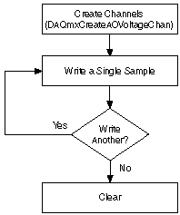 L'organigramme suivant décrit les principales étapes requises dans une application NI-DAQmx pour générer une tension. Vous pouvez aussi configurer une tâche pour générer une tension en utilisant l'Assistant DAQ.