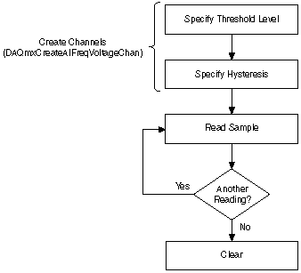 L'organigramme suivant décrit les principales étapes requises dans une application NI-DAQmx pour mesurer la fréquence analogique. Vous pouvez aussi configurer une tâche pour mesurer la fréquence analogique en utilisant l'Assistant DAQ.