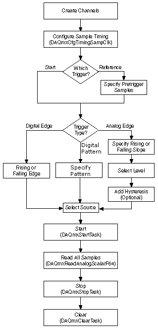 L'organigramme suivant décrit les principales étapes à suivre pour ajouter un déclenchement à une acquisition. Si vous préférez, vous pouvez configurer un déclenchement en utilisant l'Assistant DAQ.