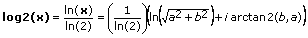 log2(x) a la même représentation numérique que x. Lorsque x est de la forme x = a + bi, c'est-à-dire lorsque x est complexe, l'équation suivante définit log2(x): |