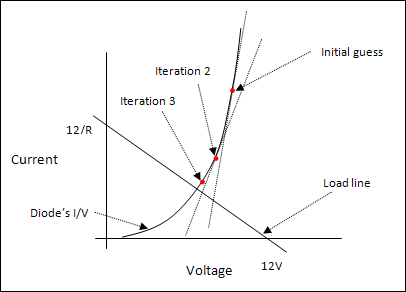 To find this intersection, the simulator begins by making a “guess” about the diode's voltage. The diode is then linearized about this guessed value using the derivative of the I/V curve. The linearization of the diode effectively models the diode as a resistor in parallel with a current source. This allows the simulator to use the Nodal Analysis and Matrix Solution process to find a solution.