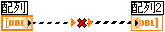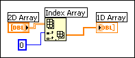ソース配列の次元が出力配列よりも次元数が多い場合は、ワイヤを右クリックしてショートカットメニューから指標配列を選択します。以下の例では、「指標配列」関数の指標入力に0が配線されており、2D配列制御器の0行目が1D配列表示器の入力値になっています。