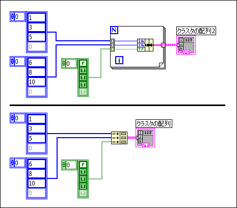 以下のブロックダイアグラムは、配列のセットを指標付けしてクラスタを作成する2通りの方法を示しています。「指標 & バンドルクラスタ配列」関数を使用することで、実装時間とメモリ使用量を向上できます。