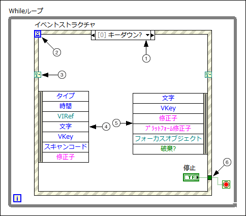 イベントデータノードは、イベント発生時にLabVIEWが返すデータを認識します。 Unbundle By Name 機能と同様に、ノードのサイズを縦に変更し、必要な項目を選択することが可能です。イベントデータノードを使用して、タイプや時間など、全イベントに共通のイベントデータ要素にアクセスできます。文字やVKeyなどのイベントデータ要素は、構成するイベントに依存します。すべてのデータ項目が未使用の場合に、イベントデータノードを表示/非表示できます。ストラクチャの枠線を右クリックし、表示項目»このケースのイベントデータノード を選択してイベントデータノードを表示または非表示にします。ノードが配線されている場合、またはフィルタイベントケース内にある場合、ノードを非表示にすることはできません。