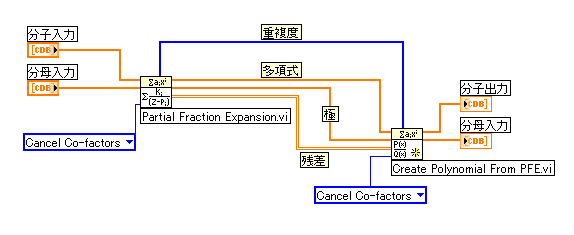 以下のブロックダイアグラムは、「PFEから多項式を作成」VIで「部分分数展開」VIから有理多項式を再構築する方法を示します。
